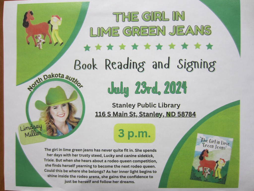 The Stanley Public Library is pleased to announce that North Dakota author Lindsey Miller will visit the library on Tuesday, July 23 at 3:00 for a book reading and signing for all ages. Mark your calendars and plan to attend!